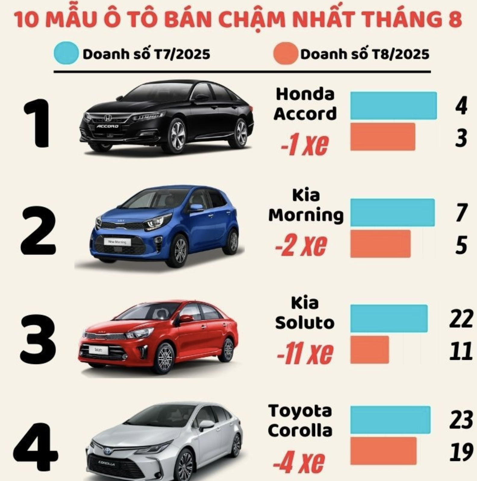 Top xe bán chậm nhất tháng 8 có một số sự thay đổi về thứ hạng, đồng thời ghi nhận sự xuất hiện của Toyota Innova - mẫu xe vừa ngừng bán tại thị trường Việt Nam.